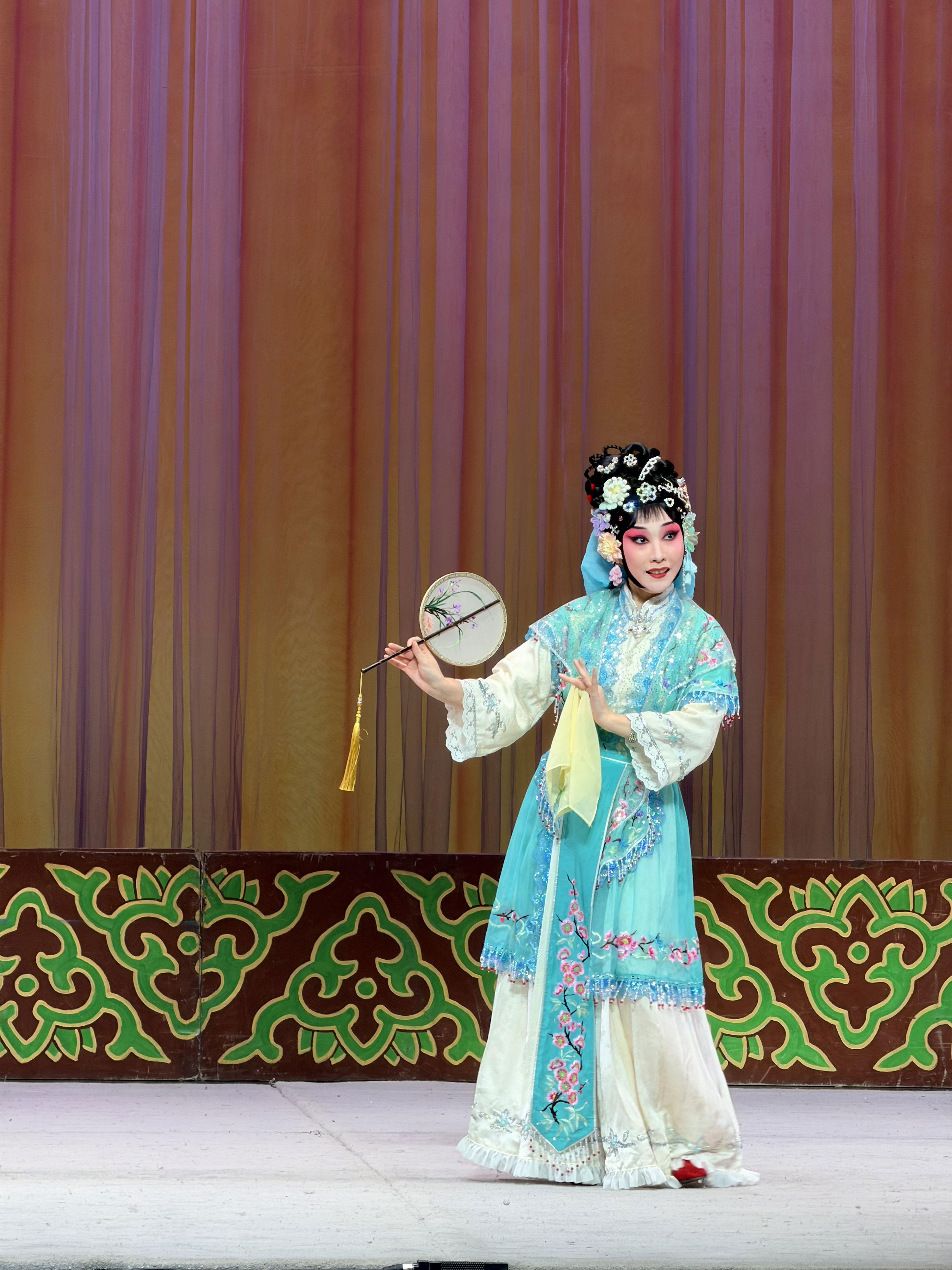 舞台上,毕艺琳率先亮相。只见她身着翠色衣裙,顾盼之间透着机灵劲儿,尤其是手上团扇、手帕、棋盘等道具不断,或扑蝶或轻甩水袖,伴随着灵动的唱腔,将红娘聪慧大胆又顽皮的丫鬟形象刻画得颇为生动,剧场内不时传来笑声。